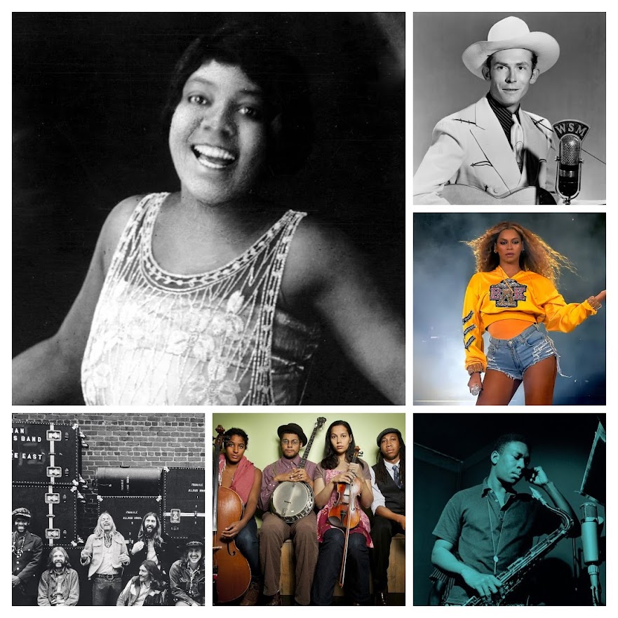 Note: The photo collage includes (clockwise, from upper left) Bessie Smith, Hank Williams (the first and only, as far as I’m concerned), Beyonce, John Coltrane, the Carolina Chocolate Drops, and the Allman Brothers Band. Southerners all.