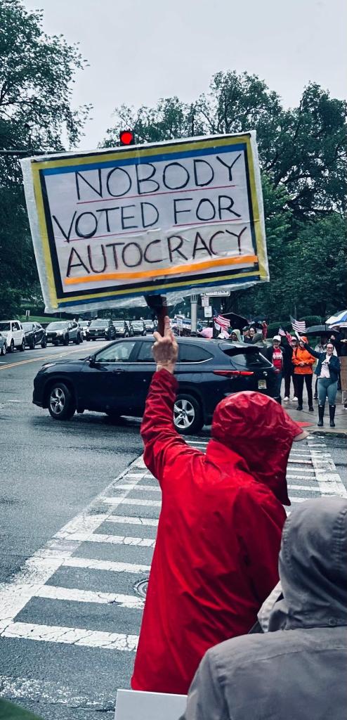 The photos that accompany this blog were taken by me, on my iPhone, on Saturday, June 14. They show a peaceful protest in our little town in northern New Jersey. The protest took place on a miserable, rainy day, but a couple hundred folks showed up anyway, to protest the current regime in America. I rode my bike there on a whim, simply because I thought it was the most important thing I could do that day. And I’m glad I did.